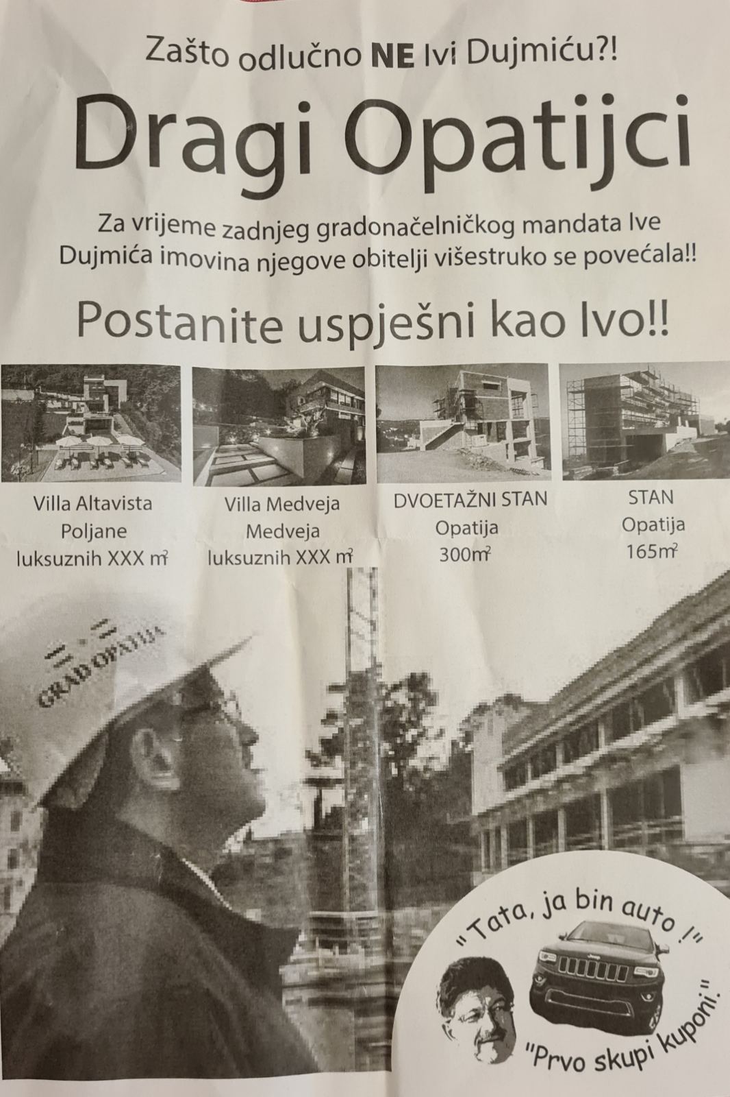 "Drage sugrađanke i sugrađani, proteklih dana mnogi od vas su u svojim poštanskim sandučićima pronalašli klevetničke letke u kojima se lažima mene i moju obitelj prikazuje kao kriminalce, čime je počinjeno kazneno djelo klevete kažnjivo po članku 149. stavak 1. i 2. Kaznenog zakona. Na letku se nalaze poruke s pozivom na mržnju usmjerenu prema meni kao kandidatu za gradonačelnika, zato postoji osnovana sumnja da je počinjeno i kazneno djelo javnog poticanja na mržnju iz članka 325. stavak 1. Kaznenog Zakona. Upravo sam zato podnio kaznenu prijavu protiv nepoznatog počinitelja. Policija će provoditi istražne radnje kako bi došla do grupe i organizacije koja je organizirala distribuciju letaka i vodila grupu, jer je potpuno jasno da pripremu, ispis i distribuciju letaka nije mogla vršiti samo jedna osoba, već je za navedeno bilo potrebno postojanje grupe i organizacije. Na kraju osobama i svojim protukandidatima koji su isto organizirali, a koji će se jako dobro prepoznati, poručujem da Opatijci već poznaju svog gradonačelnika te im je dosta laži i podvala. Teškim optužbama, lažima i napadom na obitelj ne dolazi se na ovu odgovornu dužnost Gradonačelnika. Takva negativna kampanja provodi se samo u nedostatku lidera i rješenja za Opatiju. Jer kada nemate ljude i rezultat koji se može ponuditi za nastavak razvoja, onda preostaju samo ovakvi očajnički potezi. Mi ćemo i dalje voditi pozitivnu kampanju, uz program za razvoj, za svakog čovjeka i za svaku obitelj. Iza nas stoje ispunjena obećanja, konkretan program uz rezultate i vidljivi napredak Opatije", naveo je Dujmić.