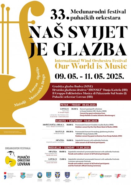 U Lovranu je ovaj vikend od petka, 9. svibnja do nedjelje, 11. svibnja na repertoaru 33. po redu međunarodni festival puhačkih orkestara „Naš svijet je glazba“ u organizaciji domaćina, Puhačkog orkestra Lovran. Festival je to koji ljubiteljima glazbe diljem Opatijske rivijere nudi dašak ovog tradicionalnog načina muziciranja u modernijem svjetlu. Puhački orkestri / limene glazbe jedan su od najstarijih oblika glazbenih formi i većinom je to udruga glazbenih amatera kojima je ponajprije zajednička ljubav prema glazbi. Kroz desetljeća, način muziciranja pa i repertoar amaterskih orkestara podigli su se na veću ljestvicu kvalitete i nadišli nekadašnja očekivanja, ali i mogućnosti pa današnjim orkestrima nema granica u žanrovima ni u načinu izvođenja repertoara.