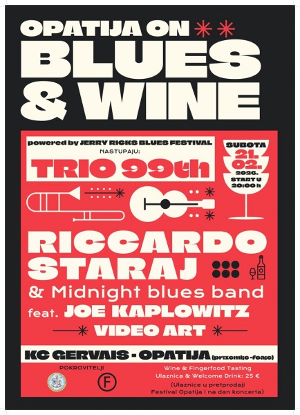 Opatija - Četvrto izdanje manifestacije Opatija On Blues and Wine održat će se u subotu, 21. veljače 2026. godine s početkom u 20 sati u prizemlju – foajeu Kulturnog centra Gervais u Opatiji. Ova glazbeno-enološka večer, koja iz godine u godinu okuplja ljubitelje bluesa, vina i dobre atmosfere, organizira se u suradnji Riccarda Staraja, Zajednice Talijana Mošćenička Draga i Festivala Opatija.