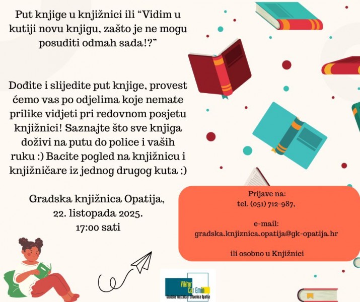 Opatija – Gradska knjižnica Opatija poziva sve ljubitelje knjige na posebno događanje „Put knjige“, koje će se održati u srijedu, 22. listopada u 17 sati. Posjetitelji će imati priliku zaviriti iza kulisa knjižnice i upoznati knjižničare i knjižnične procese iz potpuno novog kuta.