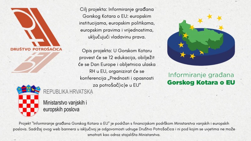 Gorski kotar - Društvo Potrošačica provodi projekt „Informiranje građana Gorskog Kotara o EU“, kojeg sufinancira Ministarstvo vanjskih i europskih poslova. Tijekom četiri mjeseca provedbe projekta u Gorskom Kotaru provest će se 12 edukacija za mlade, obilježit će se Dan Europe i obljetnica ulaska Republike Hrvatske u EU, te će se organizirati konferencija „Prednosti i opasnosti za potrošač(ic)e u EU“.