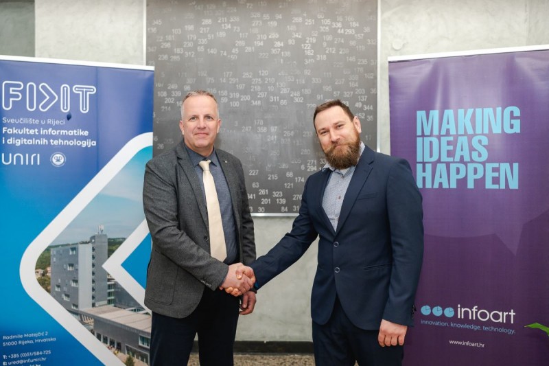 Uni Ri prorektor Marin Karuza i voditelj projekta Vjekoslav-Leonard Prčić"Uloga FIDIT-ovog tima obuhvaća znanstveno-istraživačku podršku tvrtki Infoart, zajedničko objavljivanje rezultata u relevantnim znanstvenim časopisima te pripremu i prijavu daljnjih EU projekata temeljnih na postignutim rezultatima. Projektni tim FIDIT-a čine znanstvenici dvaju laboratorija Fakulteta, Laboratorija za razvoj informacijskih sustava i Laboratorija za semantičke tehnologije", istaknula je dekanica FIDIT-a prof. dr. sc. Patrizia Poščić.