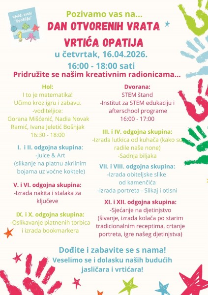 Opatija - Dječji vrtić Opatija organizira Dan otvorenih vrata koji će se održati u četvrtak, 16. travnja od 16 do 18 sati, pružajući priliku roditeljima i djeci da se upoznaju s radom i programima vrtića.