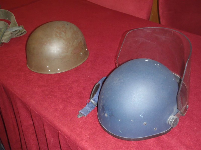 Zaštitna kaciga MPČ-1, sa zaštitnim vizirom i švicarska padobranska kaciga, korištne od strane policije, u Domovinskom ratu.