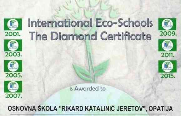 Opatija – Dijamantnu plaketu međunarodne Eko škole osvojila je Osnovna škola ''Rikard Katalinić Jeretov''. Nagradu koja se dodijeljuje za vrhunska dostignuća u edukaciji i menadžmentu održivog razvoja preuzela je nedavno delegacija u Zagrebu.