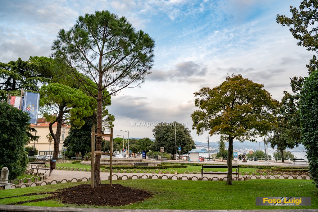 Opatija - Brojno stanje drveća u parku pokraj fontane na Slatini od prekjučer je ponovo doseglo brojku koju je imalo prije uklanjanja stogodišnje pinije. Vrijedni vrtlari tako su 'škuju' u zelenilu popunili novim stablom pinije, koja doduše nema raskošniju krošnju kao prethodnica, ali dajmo joj vremena s nadom da će nadživjeti svoju prethodnicu. I dok čekamo službene nalaze zbog kojih se stara pinija posušila, vrijedi istaknuti da će se zahvaljujući projektu Novi život stoljetne pinije odrezanom deblu udahnuti novi život.