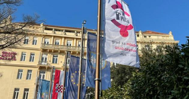 Opatija - Nakon jučerašnje svečanosti u Udruzi gradova u Zagrebu na kojoj je Grad Opatija, uz 8 drugih hrvatskih gradova, dobio prestižni certifikat "Grad za mlade" od 2021. - 2024. na Trgu Slatina jutros je zavijorila i prigodna zastava.