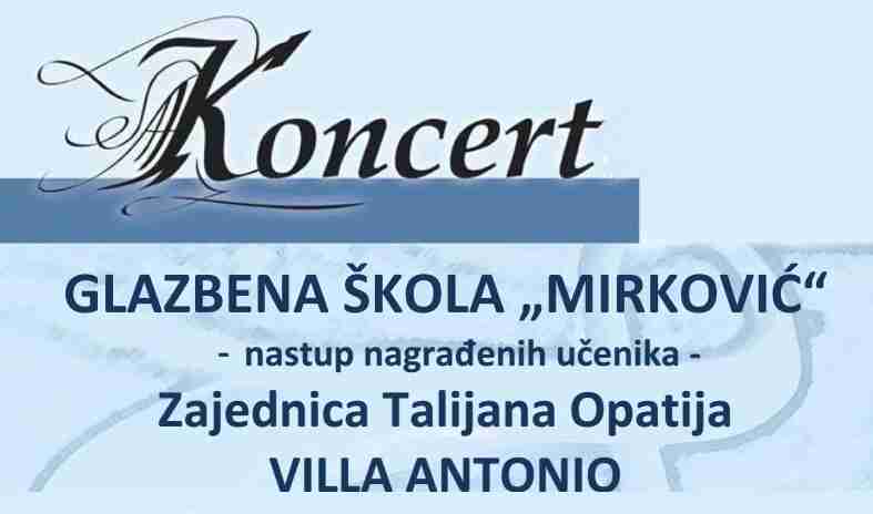 Opatija – Glazbena škola Mirković organizirat će nastup svojih nagrađenih učenika ovog petka, 13. veljače, u prostoru Zajednice Talijana Opatija u Vili Antonio.
