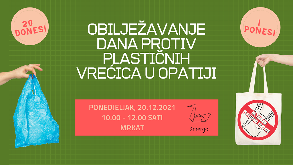 Ovim putem pozivamo sve zainteresirane građanke, građane i slučajne prolaznike da nam se pridruže u Opatiji, u ponedjeljak, 20. prosinca 2021. od 10 do 12 sati ispred tržnice Mrkat i da zamijene 20 iskorištenih plastičnih vrećica za praktičnu i okolišno prihvatljivu platnenu vrećicu s porukom.